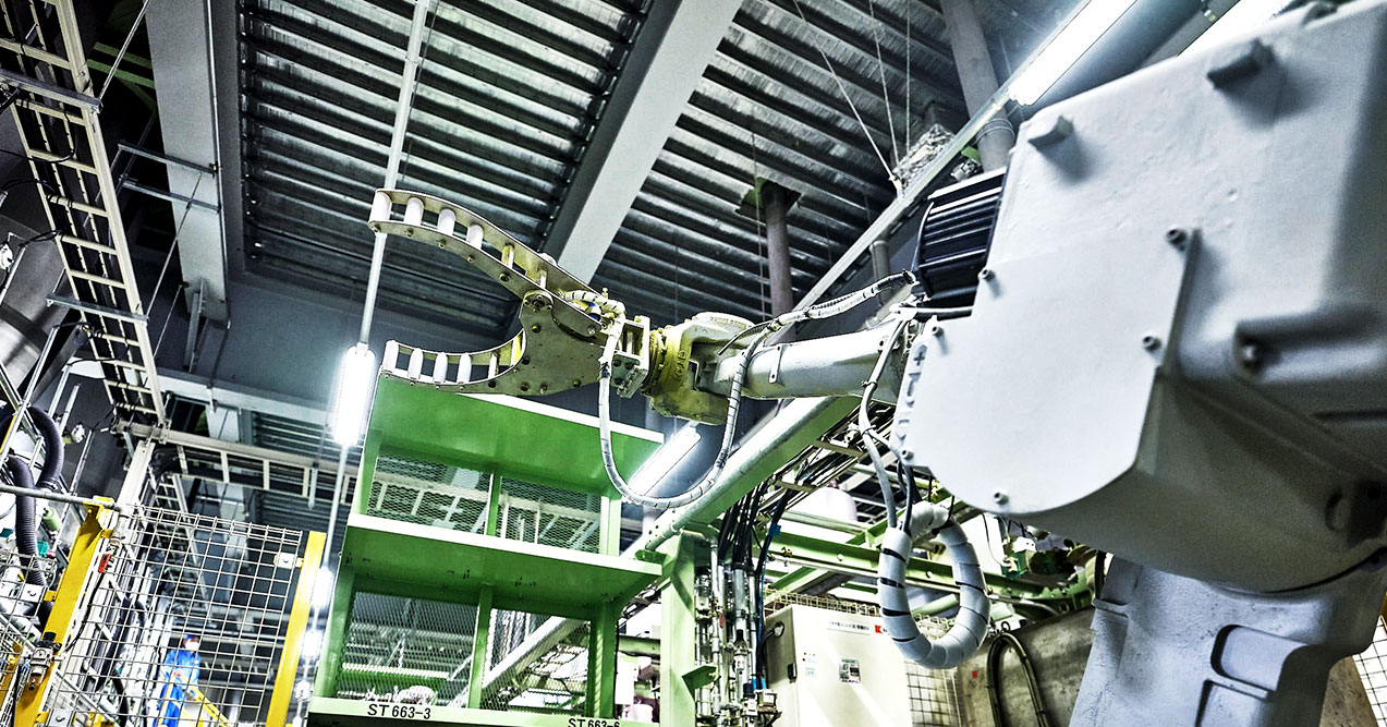 自動化設備を軸とした製造ラインを、デジタルマニュファクチャリングを活用した精密な工程制御により、モニター監視業務を中心とした少人数体制にて24時間連続操業を実現しています。